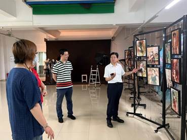 郝登峰书记(右一)与艺术设计与传媒学院实验室中心主任郑培心进行交流沟通