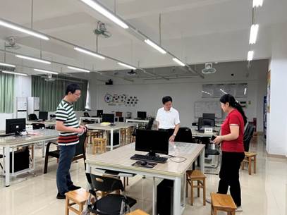 郝登峰书记(中)和设备与实验室管理处相关人员调研经济与贸易学院实验室