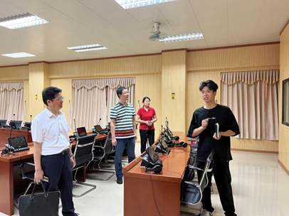 郝登峰书记(左一)听取外国语学院实验室管理员进行实验室情况介绍